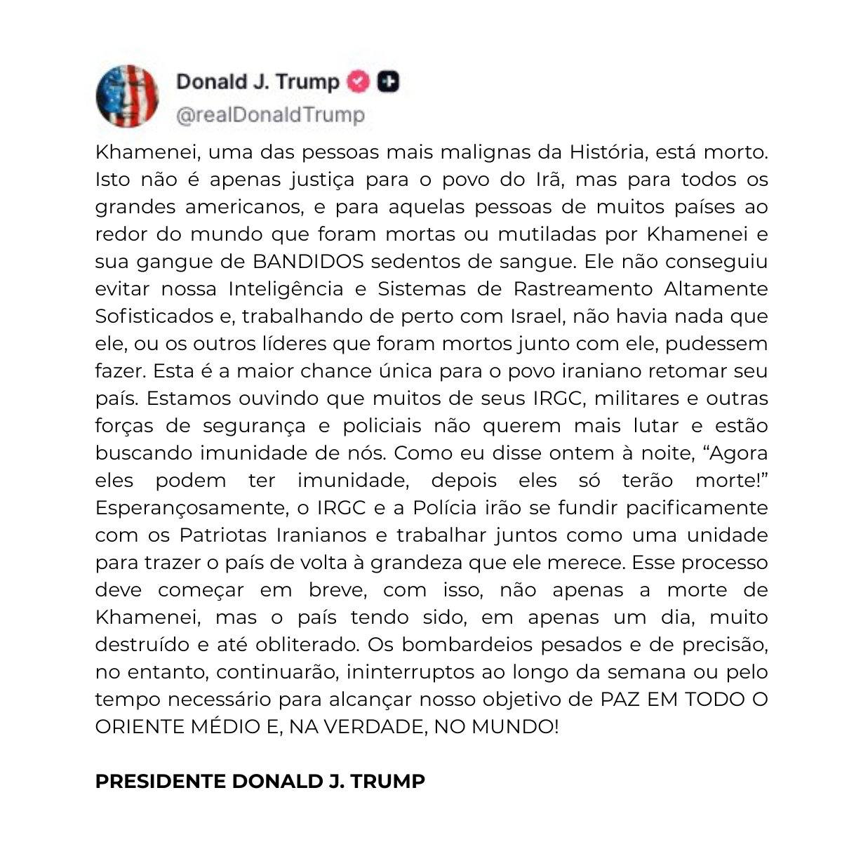 Donald Trump anuncia morte do líder supremo do Irã após ataques dos EUA e de Israel.